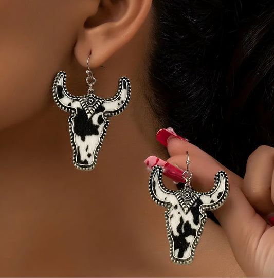 METAL COW PRINT LONGHORN DANGLE EARRINGS