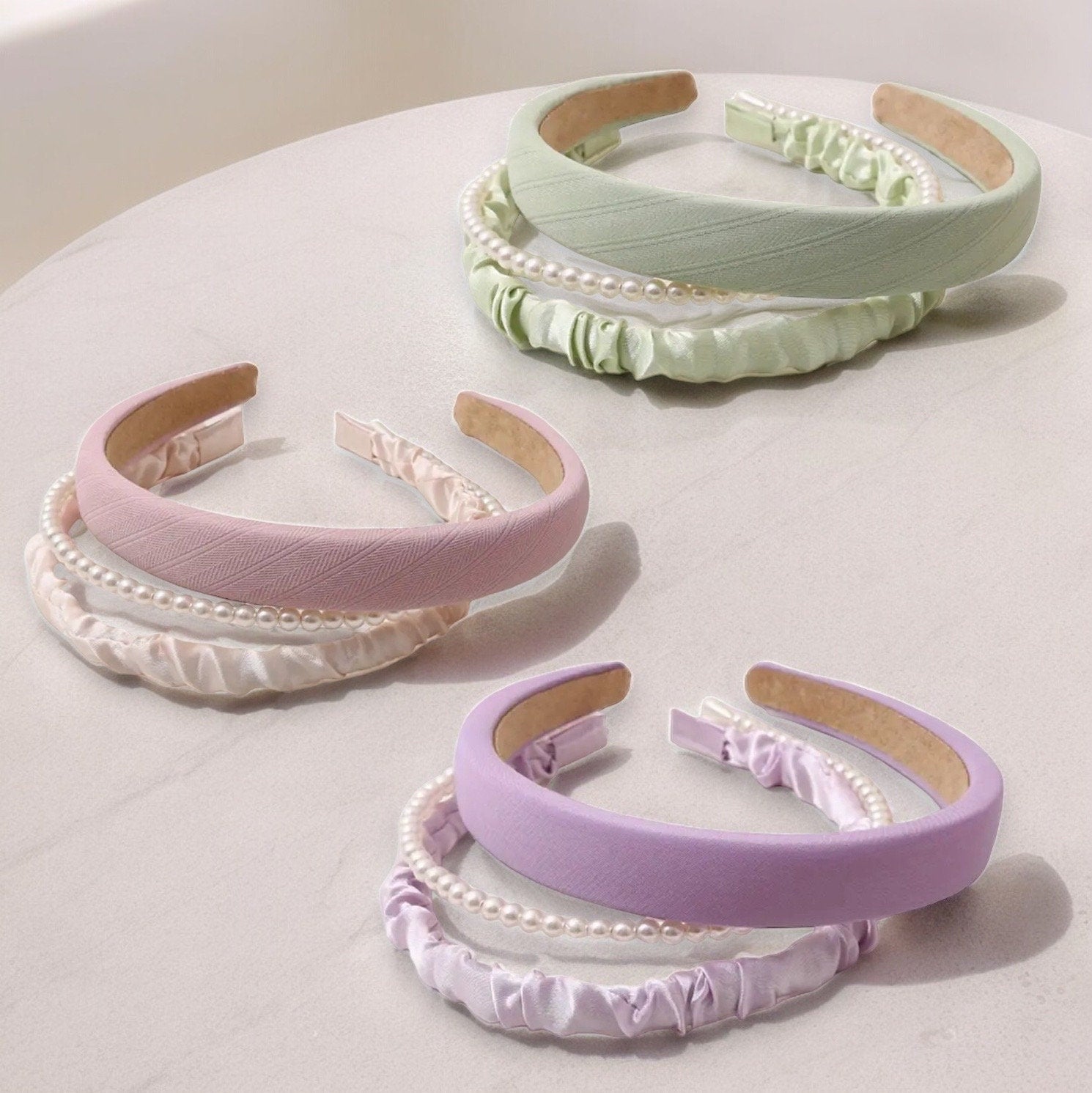 Quantity: 3 headbands per order: 1 thick headband, 1 satin headband, 1 pearl headband