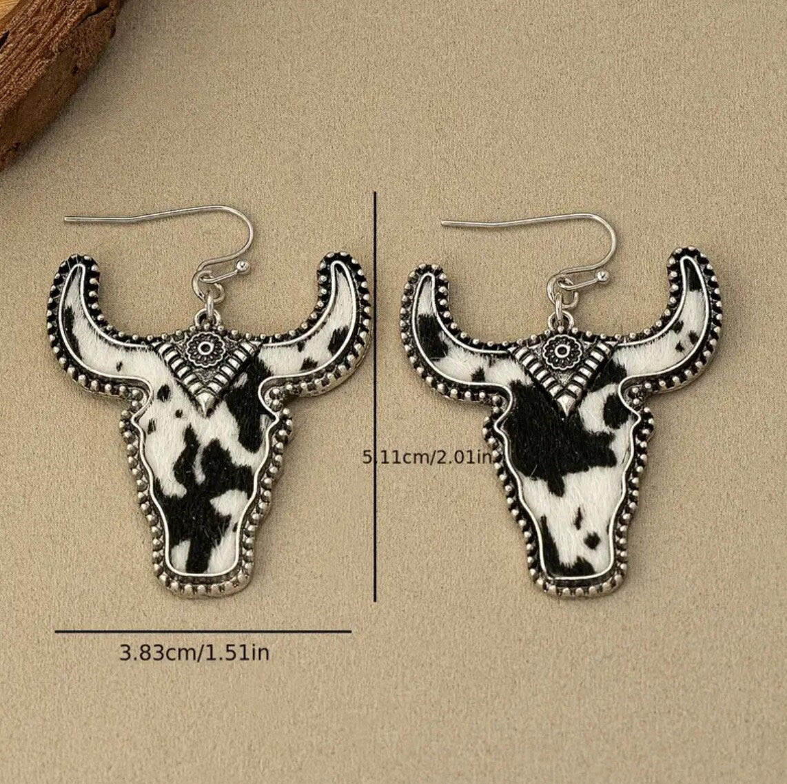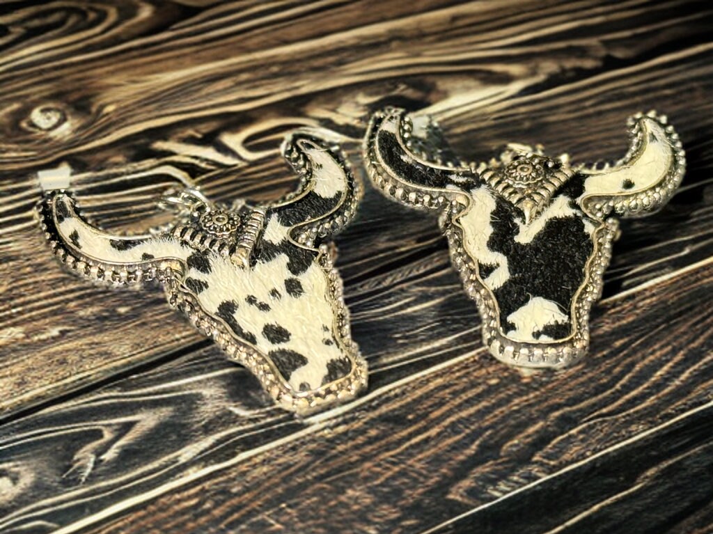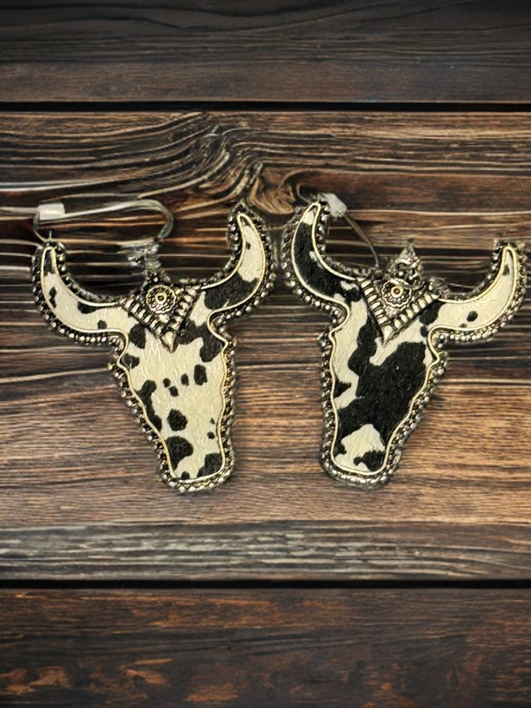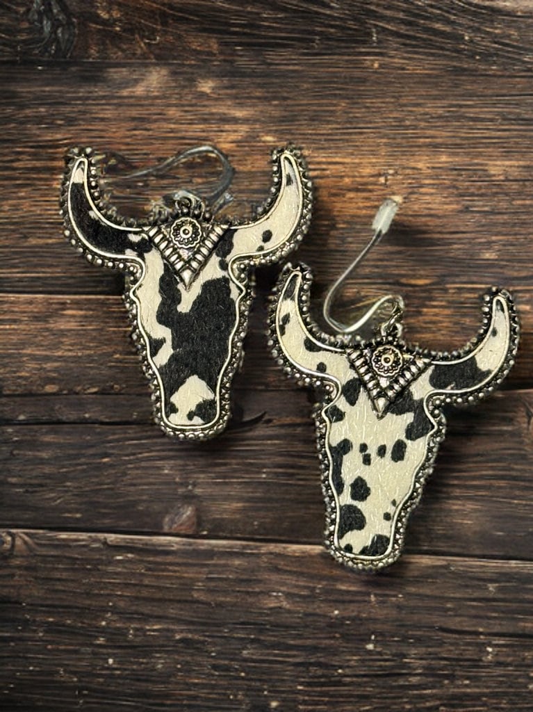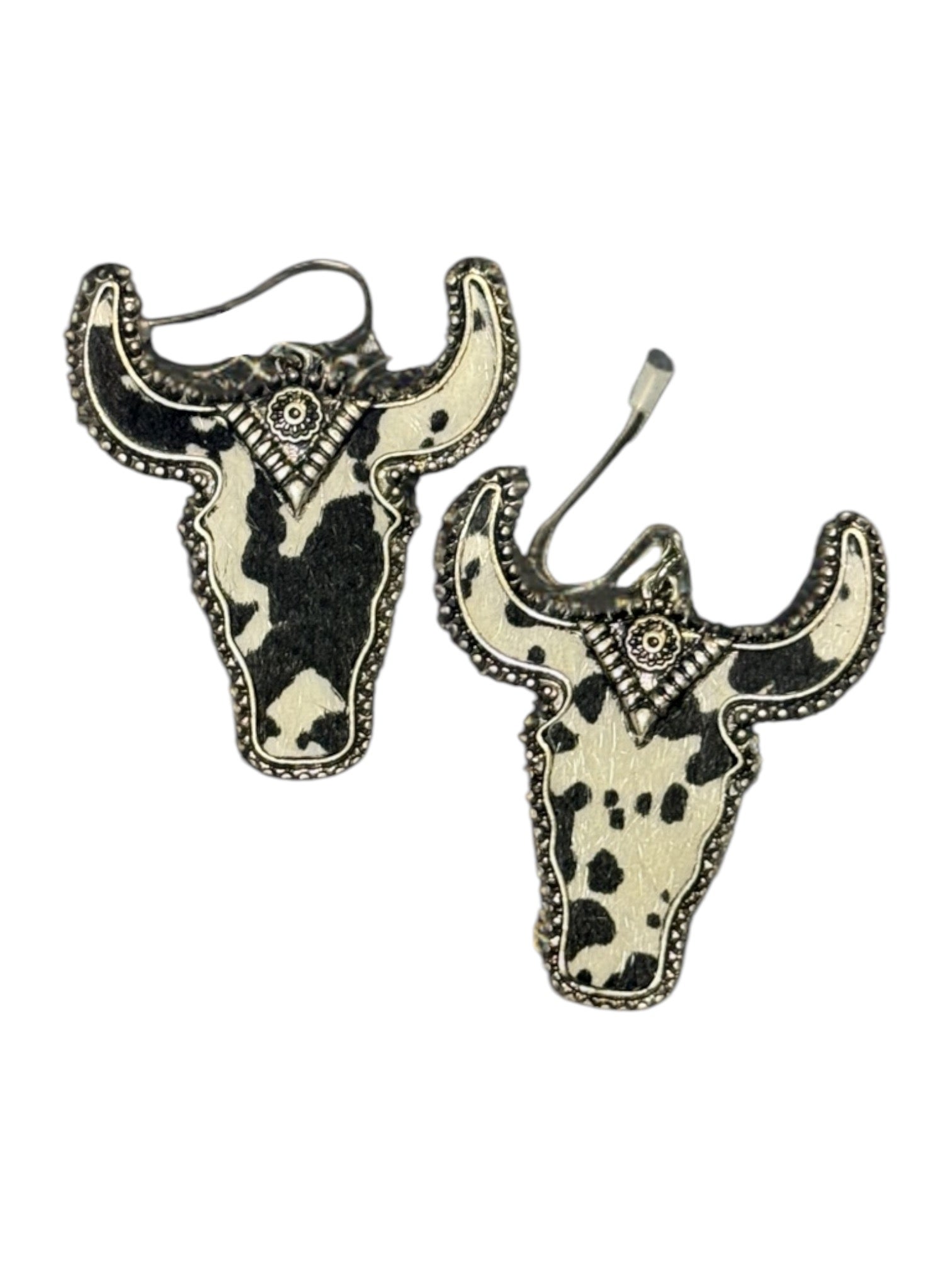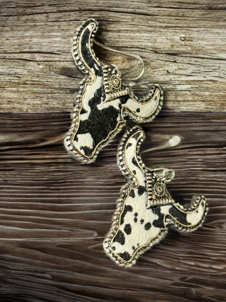 METAL COW PRINT LONGHORN DANGLE EARRINGS